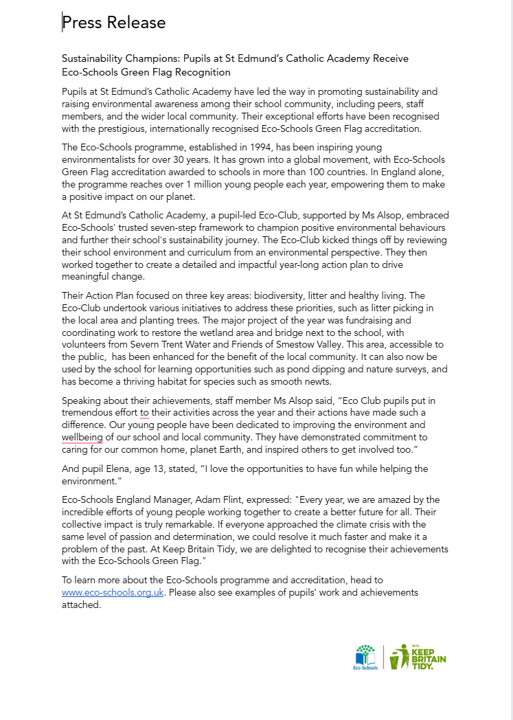 “Eco Club pupils put tremendous effort into their activities throughout the year, and their actions have made a real difference. Our young people are dedicated to improving the environment and well-being of our school and local community. They’ve shown true commitment to caring for our common home, planet Earth, and have inspired others to get involved too.”