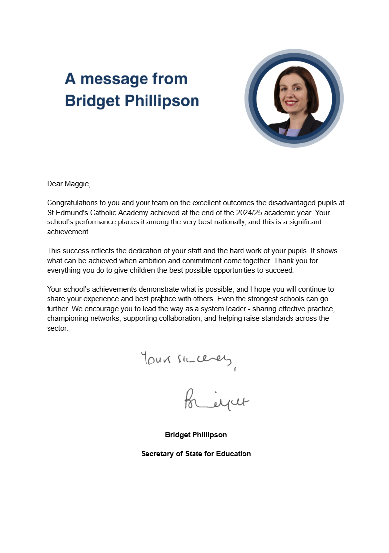 Our principal, Maggie Hazeldine, was delighted and proud to receive a letter from Bridget Phillipson, Secretary of State for Education, showcasing the continuing success of St Edmund’s, particularly as we ensure the best outcomes for our most disadvantaged young people.